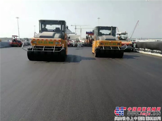 长安大学王选仓教授、长安大学姚爱玲博士、长安大学姚莉娜教授在中大机械集团董事长綦开隆陪同下,到港珠澳大桥沉管隧道沥青路面摊铺现场观摩PowerDT2000抗离析超大型多用途"变形金刚"整幅宽摊铺。