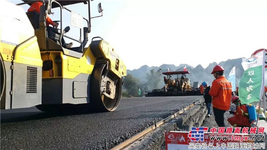 热烈祝贺河池-百色路面c标湖南路桥沥青下面层实验路顺利开铺!